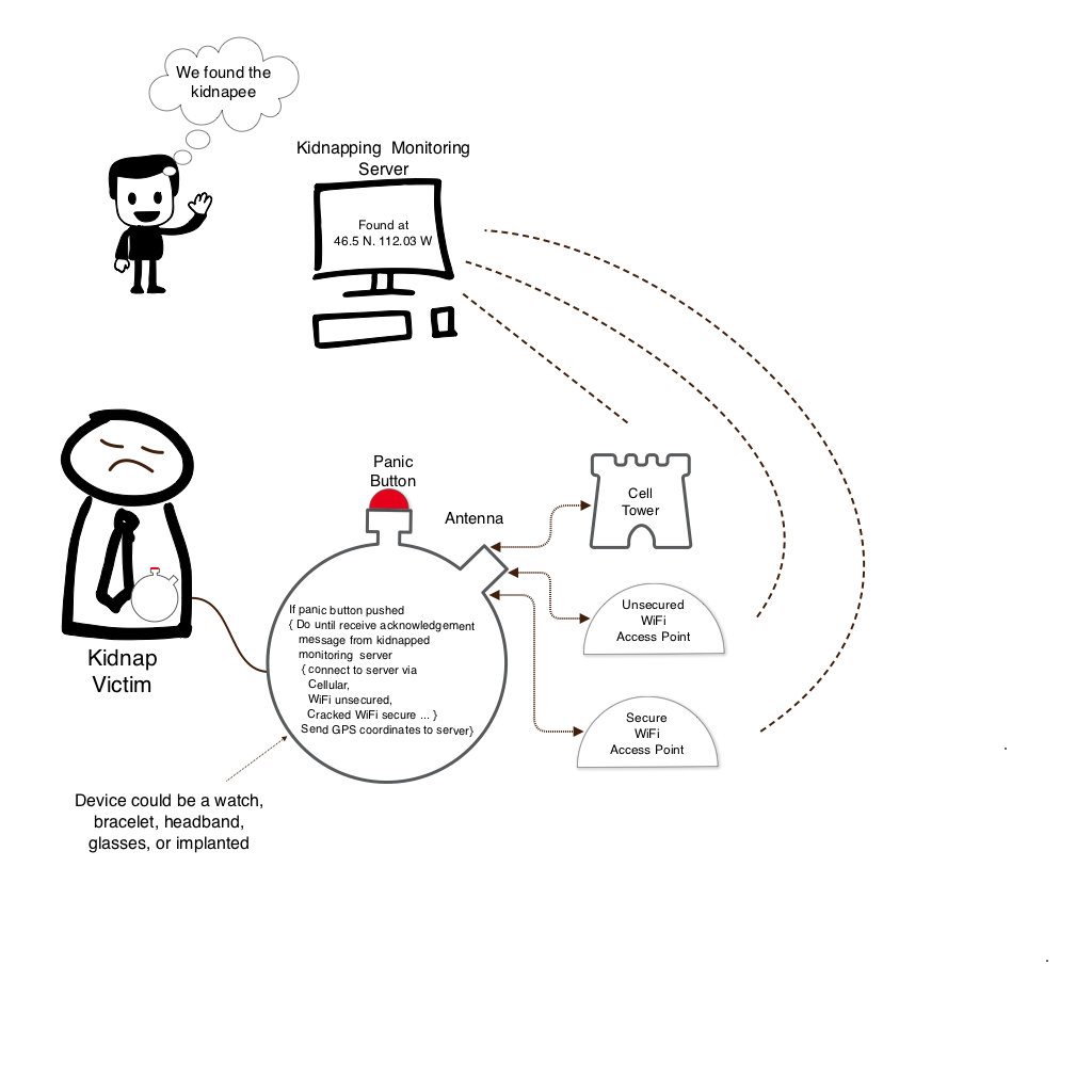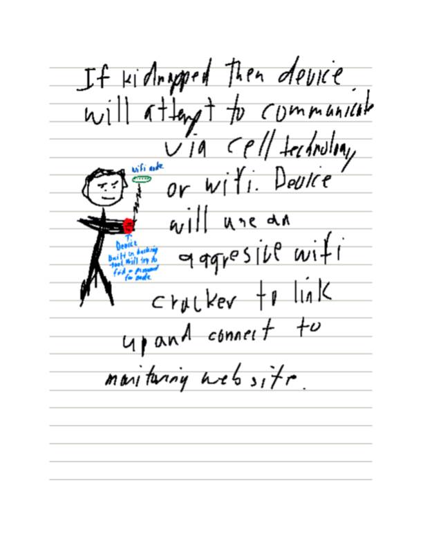 Figures 1 and 2 illustrates the migration of a thought experiment involving tracking individuals, pets and expensive assets. The initial drawing and narrative was started on Sunday evening and 3.2 was completed by 7am on Tuesday. Feedback from several individuals helped to refine the drawing.  Most of the time was spent futzing around with the interfaces of the two apps and locating symbols and graphics. The idea was derived from several student projects and from watching my son crack our Wi-Fi password in less than an hour using Backtrack. I think similar cracking code could be implemented in a very small unobtrusive device.  CPU, memory, Wi-Fi, cellular and GPS chipsets are shrinking in size and price. This technology has undoubtedly been developed in some form. But, there is always room for improvement and a thought experiment can be used to drive that process.